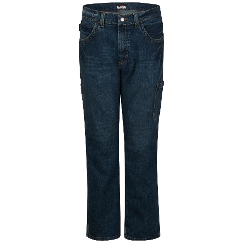 This stretch denim jean fits like your weekend jeans and moves with you while you work. Relaxed through waist, hip, and thigh to allow for easy movement. Increased durability with triple needle felled out seams and seat seam. Five traditional jean style pockets, additional ruler pocket on right leg and utility pocket on left leg adds extra storage. Utility loop on left hip. Reinforced pockets help prevent holes.
