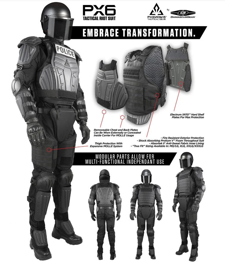 The Damascus Gear Phenom 6 PX6 Tactical Riot Suit is by far the most versatile crowd control gear available today.