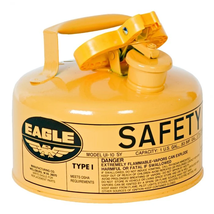 Eagle Galvanized Steel Type-I Safety Cans meet OSHA and NFPA Code 30 requirements and are UL and ULC listed and FM approved for safe handling and storage of gasoline and other flammable liquids. Eagle cans feature environmentally friendly Lead Free Technology, constructed of 24-gauge hot dipped galvanized steel. Other manufacturers’ safety cans use lead coated terne steel. Available in Blue for the storage of Kerosene, Yellow for the storage of Diesel, and Green for the storage of Combustible liquids, such as oils. Usually ships within 4 business days.