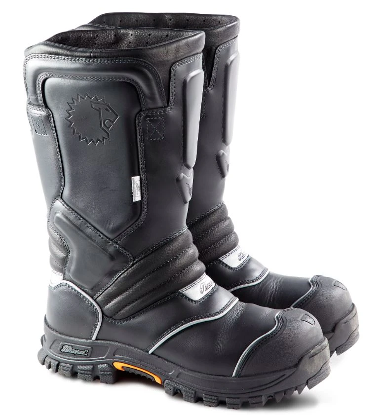 - Waterproof, flame- and cut-resisting leather upper with abrasion-resisting rubber toe