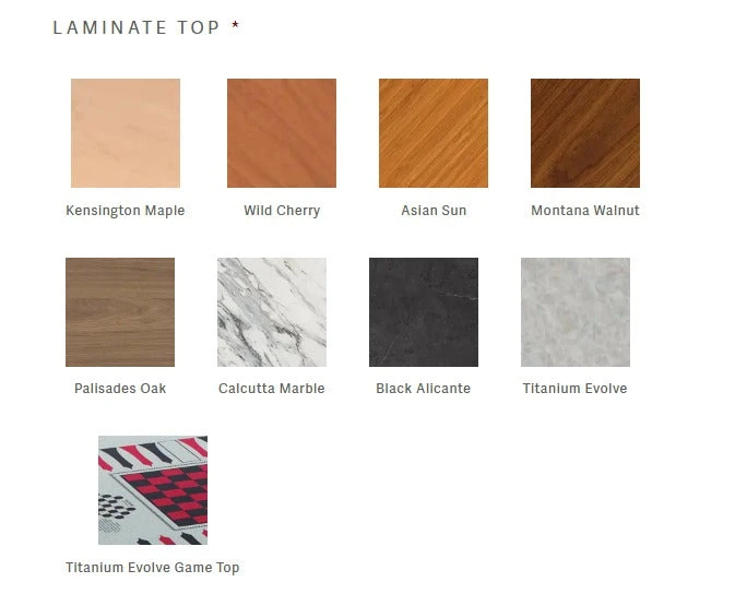 - Molded edge color/top color combinations: Black/Titanium Evolve, Wild Cherry/Wild Cherry, Kensington Maple/Kensington Maple, Asian Sun/Asian Sun, Montana Walnut/Montana Walnut, Black/Titanium Evolve Game Top