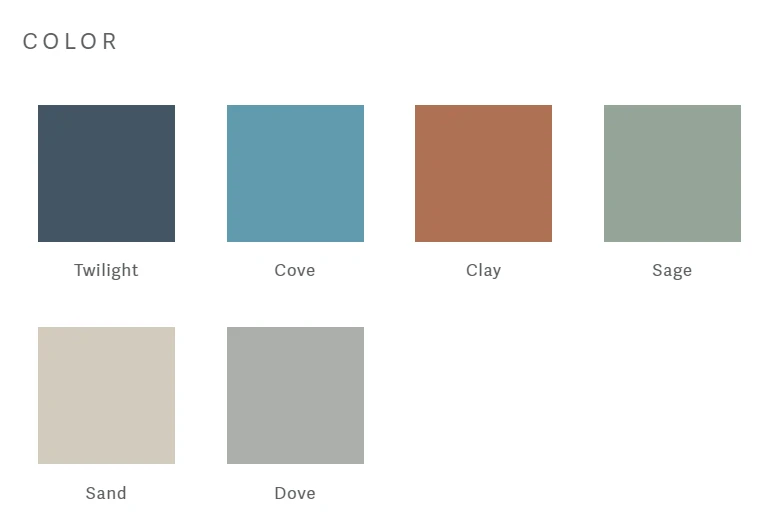 - Seat colors: Twilight, Sage, Clay, Sienna, Dove, Raven
