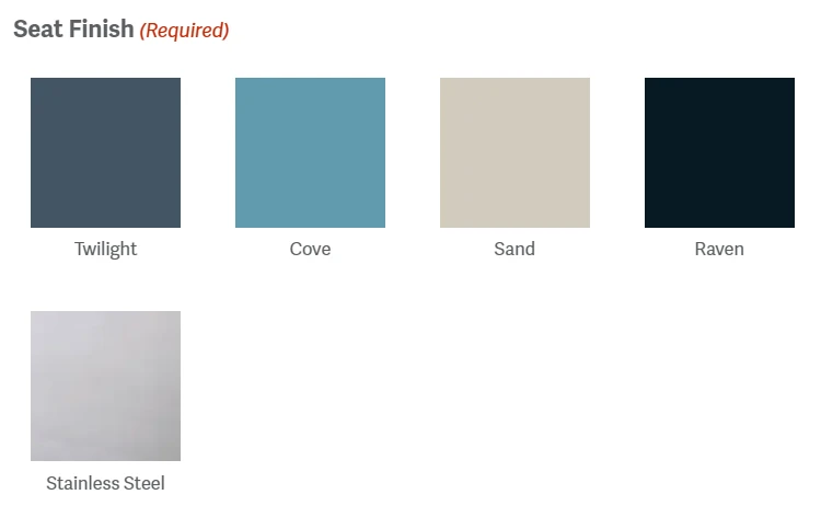 - Seat colors: Twilight, Cove, Sand, Raven, Stainless Steel