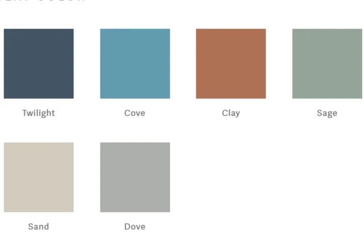 - Colors: Twilight, Cove, Sage, Clay, Sand, Dove
