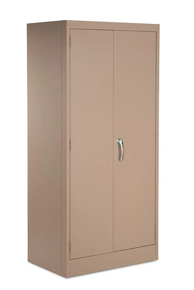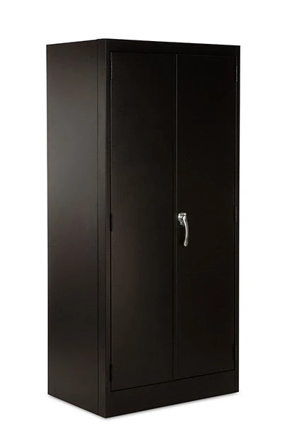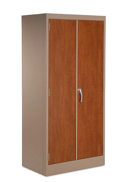 - Cut, formed, welded steel, powder coated steel (Wardrobe end panels, top, back, shelf: 18 gauge steel; Door panels: 20 gauge steel; Door frame: 16 gauge steel; Six 3½”, 5 knuckle hinges welded to frame; Bottom support bracket: 16 gauge steel; Leveler support brackets (gussets), J-bar: 14 gauge steel)