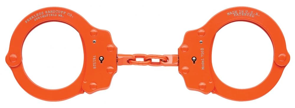 Peerless Handcuffs Model 750C chain link handcuffs have a color finish to help prevent equipment loss by allowing for easy property identification and tracking. Color can also be used to enable or reinforce a classification system such as threat level, medical condition, jurisdiction and more. These top quality chain-link handcuffs feature spun rivet construction and push-pin double lock capability.