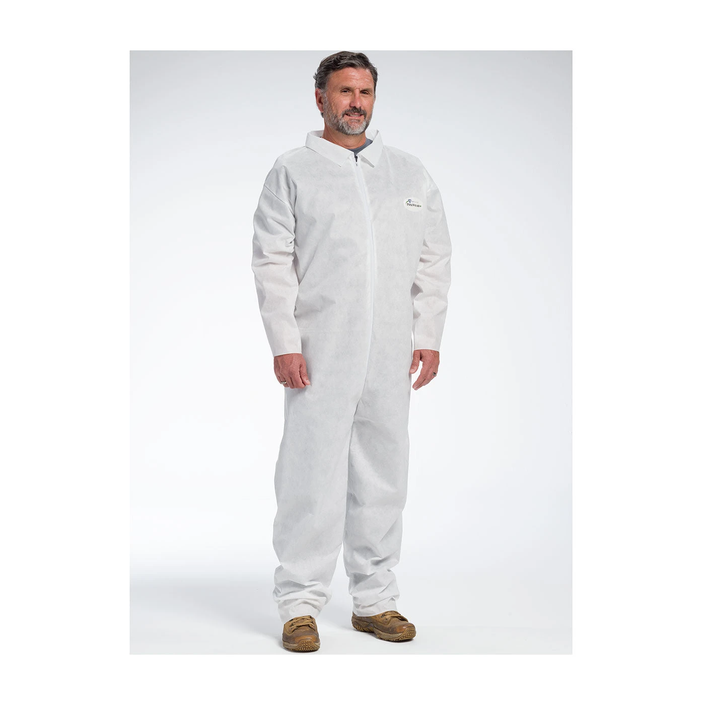 These white disposable coveralls are made of West Chester PosiWear M3 material. Five layers of spunbond and meltblown polypropylene filters particulates preventing them from reaching wearer but allowing for a high level of breathable comfort.
