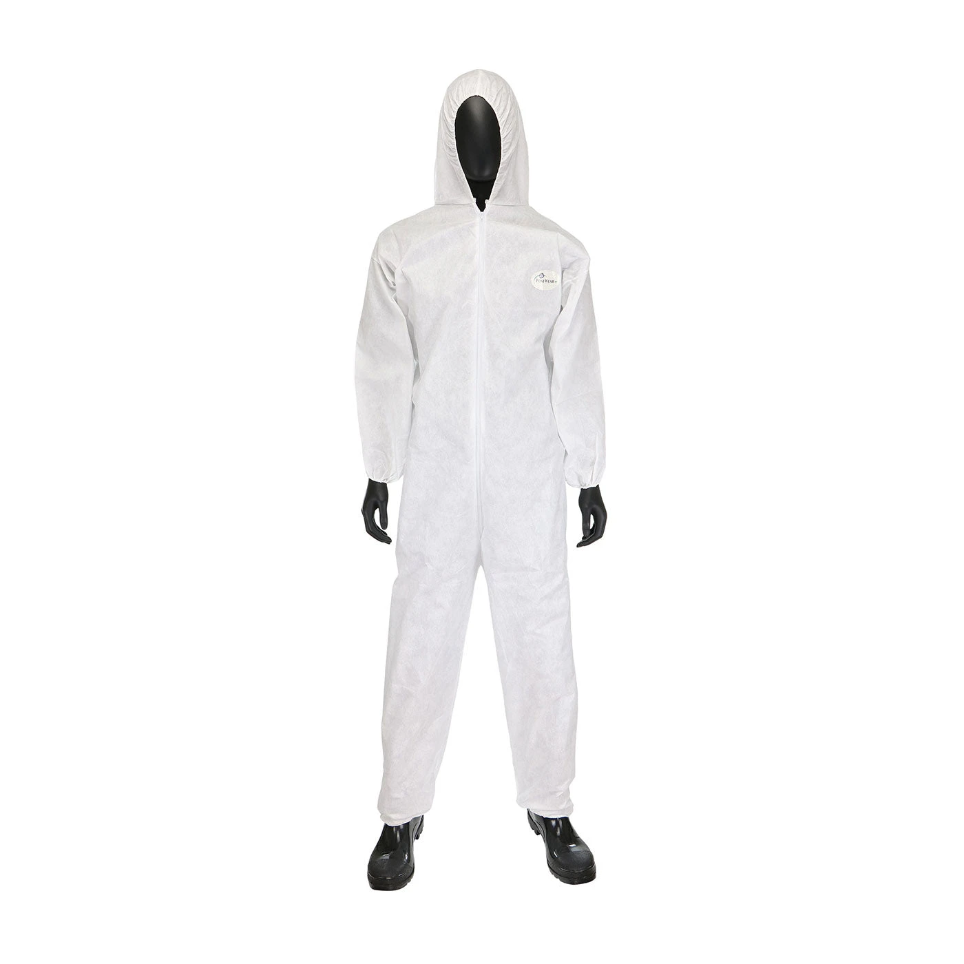These white disposable coveralls are made of West Chester PosiWear M3 material. Five layers of spunbond and meltblown polypropylene filters particulates preventing them from reaching wearer but allowing for a high level of breathable comfort.