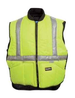 The Refrigiwear High Visibility Iron-Tuff Vest has a longer back for extra warmth, stretch knit side gussets for snug fit, insulated knit collar and hand warmer pockets.