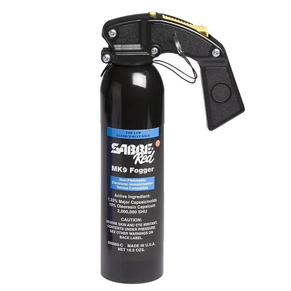 The SABRE Red 1.33% MC, 18.5 oz., MK-9 Fogger deploys twelve (12) full one (1) second bursts at a range of 25 to 30 feet. The MK-9 utilizes a pistol grip handle with safety tab and pin to prevent accidental discharge. All SABRE MK-9 pins are equipped with a safety lanyard.