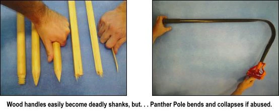 - Will shatter and bend under high-impact (as opposed to a wood handle, which can easily become a deadly shank)