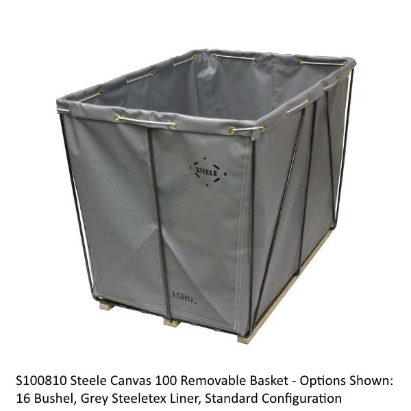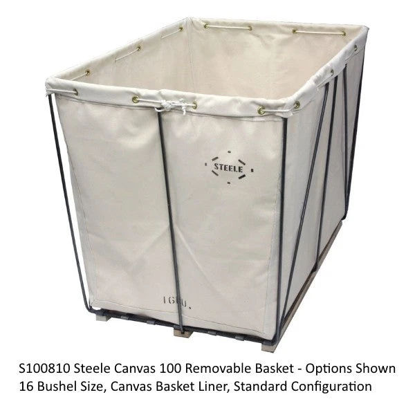 Steele Canvas Style No. 100 material handling basket with removable liner stands up to abusive environments without worrying about material tearing away from the frame. The liner is easily removed by untying the rope, allowing for laundering or replacement of the liner. Comes standard on Northern Hardwood runners, allowing them to slide smoothly across floors, making them ideal for industrial laundries and delivery trucks. Their flat steel bottom provides added strength and dependability to the base.